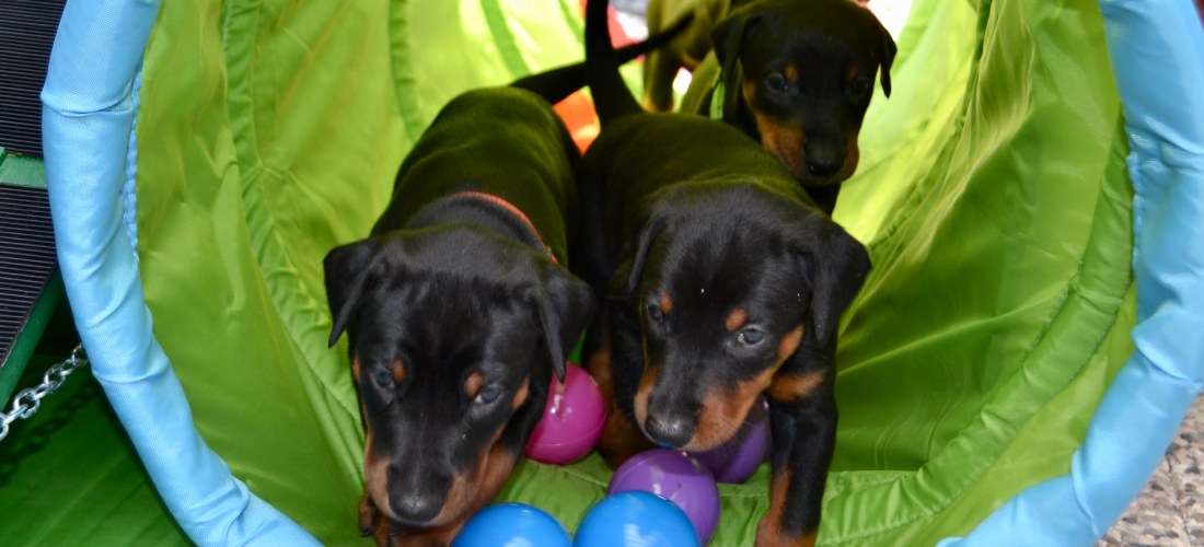 When the Adventurers ears opened, they first started to listening to classical music and later to different music and sound effects. Still in the whelping box, I added different materials and stuffed animals for them to crawl on. Now they live in a larger puppy pen, enriched with toys, balance cushions and different hanging objects. All with the purpose of habituating them to many different stimuli. In their outdoor play pen, they have many obstacles to climb on, materials to walk on and toys to “kill” 😀