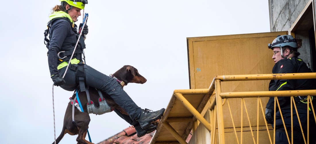 Without a doubt the rappel or rope descent is one of the most stressful parts of canine search and rescue. It is stressful for the handler, because rappeling with a dog strapped to your body is not an easy thing to do. But it is even more stressful for the dog, since she does not understand what is happening and is hanging many meters above ground with no control whatsoever.